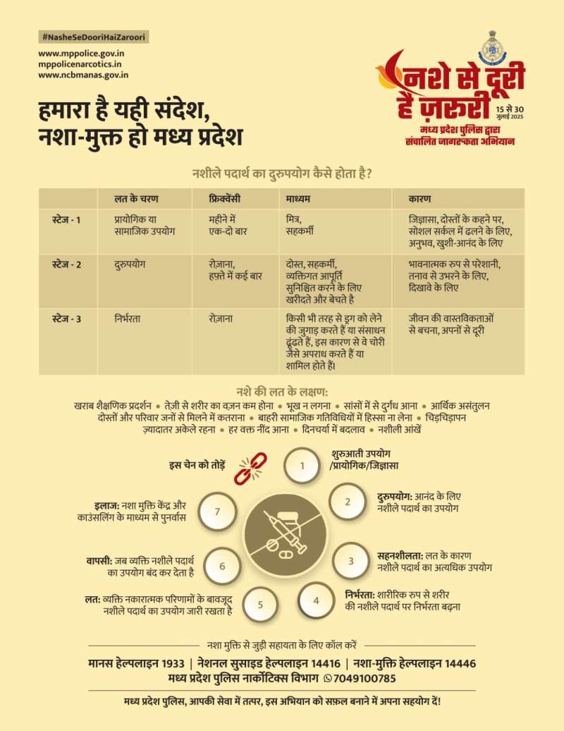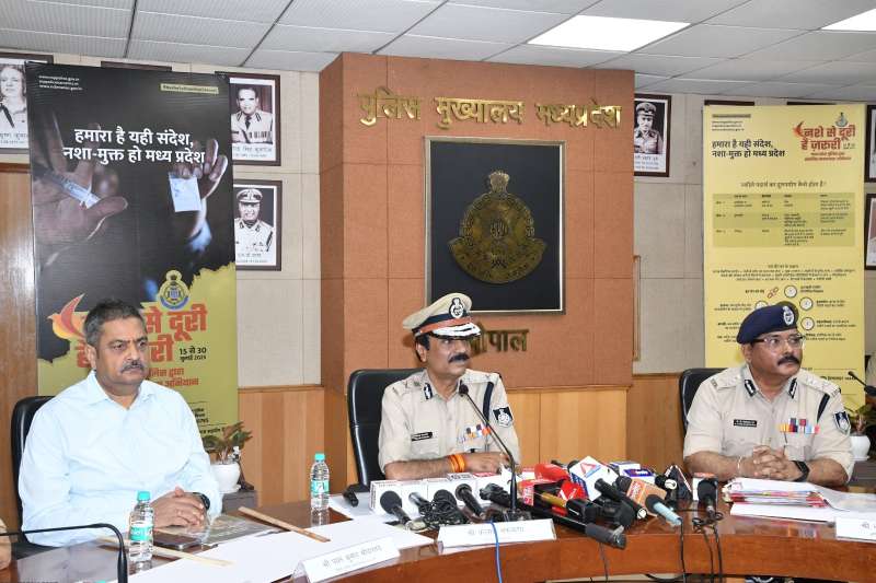 भोपाल, 15 जुलाई 2025। पुलिस महानिदेशक श्री कैलाश मकवाणा ने आज मंगलवार 15 जुलाई 2025 को पुलिस मुख्यालय, भोपाल में आयोजित प्रेस कॉंफ्रेंस में मध्यप्रदेश पुलिस द्वारा 15 जुलाई से 30 जुलाई तक चलाए जाने वाले वृहद नशा मुक्ति जन-जागरूकता अभियान ‘’नशे से दूरी-है जरूरी’’ का शुभारंभ माननीय मुख्यमंत्री डॉ. मोहन यादव के संदेश तथा अभियान के पोस्टर का विमोचन कर किया। डीजीपी मकवाणा ने कहा कि माननीय मुख्यमंत्री जी की प्रेरणा से समाज में नशे की प्रवृत्ति की प्रभावी रोकथाम के यह जनजागरूकता अभियान ‘’नशे से दूरी-है जरूरी’’ मध्यप्रदेश पुलिस द्वारा चलाया जा रहा है। उन्होंने कहा कि ड्रग्स- ये शब्द सुनते ही दिमाग में कई दृश्य उभरते हैं- दुर्बल शरीर, नशीली आंखे, धुऐं का गुबार और अंधकार। मादक पदार्थों के सेवन की लत कई युवाओं को खोखला कर उनके परिवारों को भी बर्बाद कर रही है। देश एवं प्रदेश के शीर्षस्थ राजनैतिक नेतृत्व भी इस विकराल समस्या से चितिंत एवं इसके निदान हेतु प्रयासरत है। हम सभी की ये नैतिक जिम्मेदारी है कि इसके दुष्प्रभावों से विशेषकर किशोर बच्चों और युवाओं को अवगत कराएँ और नशे से दूर रखें। उन्होंने कहा कि ‘’हमारा है यही संदेश- नशा मुक्त हो मध्यप्रदेश’’। इस अवसर पर विशेष पुलिस महानिदेशक सी आई डी पवन श्रीवास्तव, अतिरिक्त पुलिस महानिदेशक नारकोटिक्स के.पी.वेंकटेश्वर, पुलिस महानिरीक्षक ए.एन. ओ. डॉ. आशीष, पी एस ओ टू डीजीपी विनीत कपूर, सहायक पुलिस महानिरीक्षक संजीव कुमार कंचन एवं एसओ टू डीजीपी मलय जैन उपस्थित रहें।