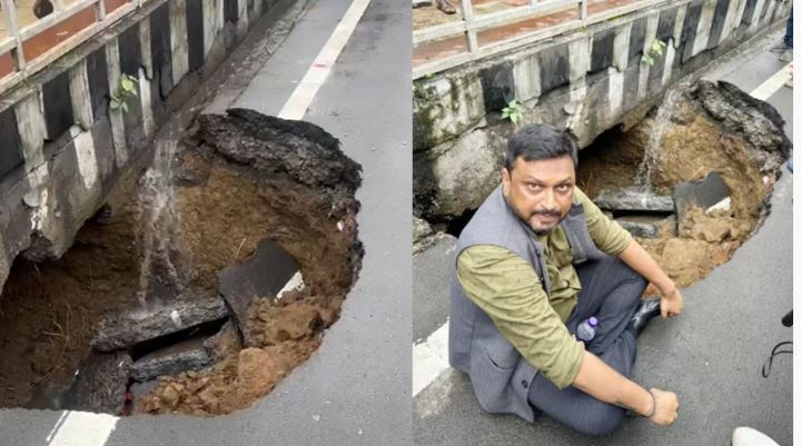 एमपी नगर में पहले से जारी सड़क गिरावट, घटिया निर्माण उजागर लगभग 10 फीट गड्ढा