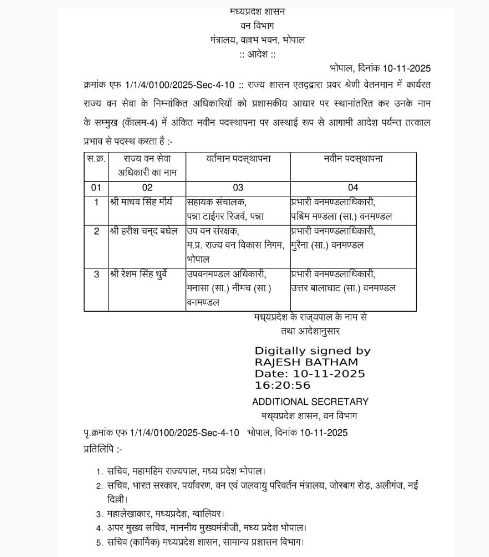 इस तरह विभाग ने एक साथ सात अधिकारियों के तबादले करते हुए बालाघाट से लेकर मुरैना तक बड़े स्तर पर फेरबदल किया है.